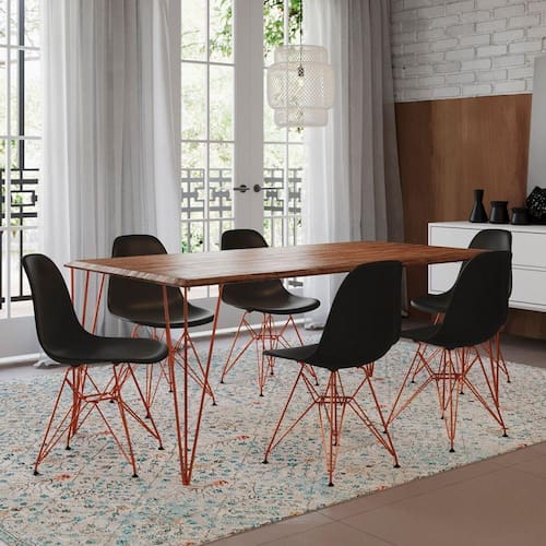 Mesa Sala De Jantar Industrial Clips Amêndoa 135x75 6 Cadeiras Eiffel Pretas De Ferro CobreO Jogo de Mesa 6 Cadeiras Eames Clips se destaca pelo design moderno e sofisticado. A Cadeira Eames Eiffel é confeccionada em polipropileno, sua base é em ferro, o que confere total resistência e conforto. O Jogo de Mesa 6 Cadeiras Eames Clips da vida ao ambiente além de combinar com todos os tipos e cores de móveis.CARACTERISTICAS CADEIRATipo: CadeiraModelo: EiffelCor: AmendoaBase: Ferro na cor CobreDIMENSÕES DO PRODUTOAltura: 85 cmLargura: 47 cmProfundidade: 50 cmAssento x Chão: 45 cmContém: 06 cadeirasCARACTERISTICAS MESATipo: MesaModelo: ClipsCor: PretoBase: Ferro na cor CobreDIMENSÕES DO PRODUTOAltura: 76cmLargura: 135cmProfundidade: 75cmObs: Imagens Meramente IlustrativaMesa Sala de Jantar Industrial Clips AmÃndoa 135x75 6 Cadeiras Eiffel Pretas de Ferro Cobre