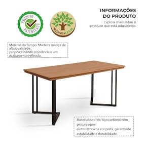 Detalhes do Produto ? Material do Tampo: Madeira maciça de alta qualidade, proporcionando resistência e um acabamento refinado. ? Material dos Pés: Aço carbono com pintura epóxi eletrostática na cor preta, garantindo estabilidade e durabilidade. ? Design: Estilo industrial que harmoniza com diversos tipos de decoração, desde ambientes mais rústicos até os mais contemporâneos.