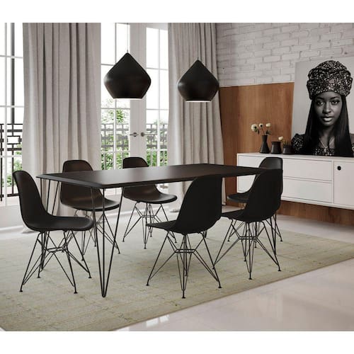 Mesa Sala De Jantar Industrial Clips Preta 135x75 Com 6 Cadeiras Eiffel Pretas De Ferro PretoO Jogo de Mesa 6 Cadeiras Eames Clips se destaca pelo design moderno e sofisticado. A Cadeira Eames Eiffel é confeccionada em polipropileno, sua base é em ferro, o que confere total resistência e conforto. O Jogo de Mesa 6 Cadeiras Eames Clips da vida ao ambiente além de combinar com todos os tipos e cores de móveis.CARACTERISTICAS CADEIRATipo: CadeiraModelo: EiffelCor: PretoBase: Ferro na cor PretaDIMENSÕES DO PRODUTOAltura: 85 cmLargura: 47 cmProfundidade: 50 cmAssento x Chão: 45 cmContém: 06 cadeirasCARACTERISTICAS MESATipo: MesaModelo: ClipsCor: PretoBase: Ferro na cor PretaDIMENSÕES DO PRODUTOAltura: 76cmLargura: 135cmProfundidade: 75cmObs: Imagens Meramente IlustrativaMesa Sala de Jantar Industrial Clips Preta 135x75 com 6 Cadeiras Eiffel Pretas de Ferro Preto