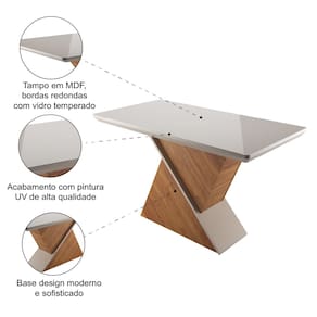 MEDIDAS: [ A ] = 77,5 cm [ L ] = 180 cm [ P ] = 90 cm PESO: 71 Kg PESO SUPORTADO: 50 Kg (distribuídos) MODELO: Mesa Sala de Jantar Tampo com Vidro Engel 1,80m MARCA: Viero COR: Estrutura: Madeirado/Off White / Tampo: Off White ESTRUTURA: Madeira maciça/MDP ACABAMENTO: Pintura UV MATERIAL DO TAMPO: MDF 40 mm POSSUI VIDRO: Sim 4 mm DIFERENCIAL: Tampo da mesa com vidro e bordas arredondadas, base sofisticada com desenho autêntico. SISTEMA DE MONTAGEM: Parafusos e cavilhas ITENS INCLUSOS: 1 Mesa, 1 manual de montagem e 1 kit parafusos INSTRUÇÕES E CUIDADOS: Limpar com pano levemente umedecido com água, não utilizar produtos abrasivos GARANTIA: 3 meses pelo fabricante