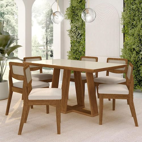 Detalhes Técnicos das Cadeiras -Assento Tapeçados, Estofados e Fixos -Encosto Tela sintética -Peso Suportado da Cadeira:90KG -Facilidade da Montagem:Média -Tonalidade da Cadeira:Freijó/Bouclé Off White -Espuma do Assento:D16 -Tipo de Pintura:UV Texturizada -Material da Estrutura:MDF 25/18mm -Medida da Cadeira:84CMx45CMx53CM