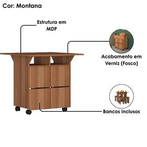 Mesa Dobrável B10, prática, compacta e funcional, ideal para ambientes pequenos! Estrutura em MDP de 15 mm com acabamento UV fosco. Modelo funcional composto por uma mesa com tampo dobrável (suportando até 20kg) e rodízios plásticos para melhor locomoção. Seu diferencial fica nos bancos embutidos (sendo possível guarda-los dentro da mesa) suportando até 100Kg cada, sem os bancos a mesa fica disposta de 06 nichos para maior aproveitamento de espaço. NÃO ACOMPANHA OBJETOS NEM DEMAIS DECORAÇÕES. Este produto será entregue em 1 volume.