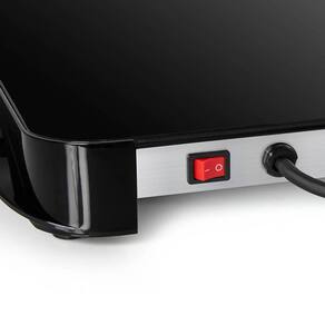 Contém pés antiderrapantes, superfície de vidro temperado com indicador luminoso em seu visor, que acende quando a mesa está em uso, proteção de sobreaquecimento por meio de fusível térmico e economizador de energia.