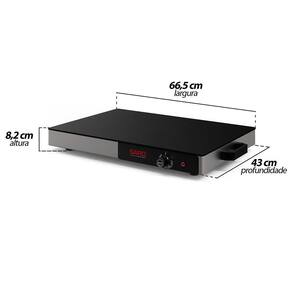 Sua estrutura é feita em aço inox com vidro temperado resistente a choques mecânicos, conta com resistência blindada e proteção contra superaquecimento, você pode ajustar a temperatura facilmente com o botão termostato.