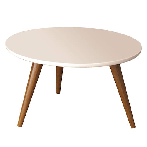 Mesa de café moderna de 24 polegadas, tampo redondo de MDF branco, pernas cônicas de madeira de manga marrom