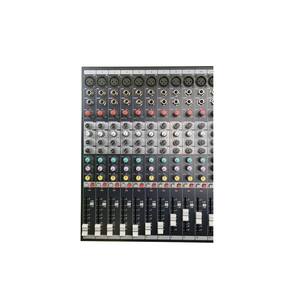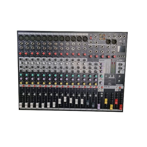 -controles de ganho, agudo, mid, grave, aux 1, aux2/fx, volume, mute, mix, sub e equilibrio (pan) para cada canal