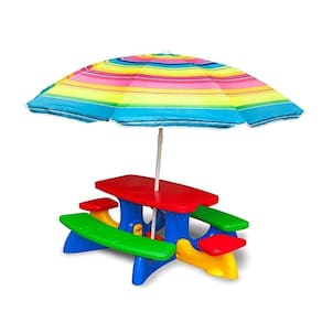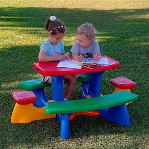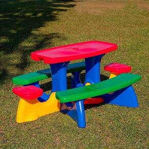 A mesinha pic-nic com bancos acoplados pode acomodar 3 crianças de cada lado e mais 2 nas extremidades. Todos os assentos ficam a uma altura de 25,0 cm do chão (topo do assento) e embaixo da mesa é instalada uma peça em X ao nível do chão para facilitar a fixação do guarda-sol(não incluso).