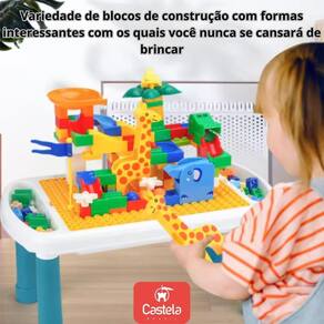 Mesinha Interativa com blocos de montar 71 Peças - Castela Mesa para Blocos de Montar com 71 Peças - Castela Deixe a criatividade das crianças fluir com a Mesa para Blocos de Montar Castela Esse conjunto é perfeito para momentos de diversão e aprendizado, com uma mesa prática e 71 peças de blocos de montar que estimulam a imaginação e o desenvolvimento da coordenação motora. Características: Mesa multifuncional: Superfície compatível com blocos de montar, ideal para criar e brincar. 71 peças de blocos: Coloridas e fáceis de encaixar, para construir e explorar a criatividade. Material durável e seguro: Feita com plástico de alta qualidade, ideal para crianças. Design prático: Espaço integrado na mesa para armazenar os blocos e manter a organização. Atividades variadas: Além de montar blocos, a mesa pode ser Utilizado para desenho, escrita e outras brincadeiras. Ofereça uma experiência divertida e educativa para as crianças com a Mesa para Blocos de Montar Castela Um presente perfeito para estimular a criatividade e proporcionar horas de entretenimento. CARACTERÍSTICAS TÉCNICAS: Conteúdo da Embalagem: 1 Mesa e 71 peças de bloco de montar Dimensões Aproximadas do Produto: Mesa - 42cm x 28cm x 48cm Altura x Largura x Comprimento/Profundidade . Dimensões Aproximadas da Embalagem: 9cm x 28cm x 42cm Altura x Largura x Comprimento/Profundidade . Material/composição: Plástico Idade Mínima Recomendada: A partir de 3 anos Participantes: A partir de 1 pessoa Alimentação: Não se aplica Marca: Castela Brasil Referência: CBS0085 Outras informações: As cores podem variar entre as imagens mostradas acima e o produto. Imagens meramente ilustrativas. Aviso: As informações e imagens divulgadas são de total responsabilidade do fabricante/fornecedor. APROVADO PELO INMETRO Homologação Inmetro: 4026/2018-BRI-2 Marca: Não Informado