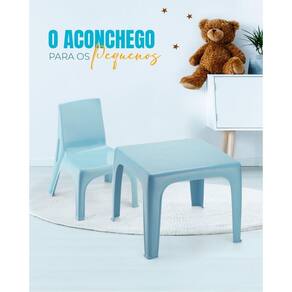 A cadeirinha é produzida em plástico industrial de excelente qualidade na cor azul e 100% nacional e contém uma ótima ergonomia e designer moderno, gerando conforto e segurança para as crianças. Pode ser utilizada para: desenhar, pintar, brincar, conversar, estudar e muito mais. Além de tudo, é empilhável, super leve e muito fácil de transportar.