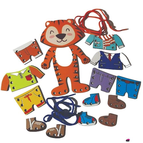 O objetivo desse alinhavo de madeira é passar o cadarço pelos furos, costurando as peças na base do tigre e montando diferentes e divertidos vestuários. Assim a criança aprende brincando