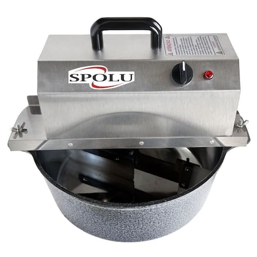Mexedor Elétrico 8L SPL408 Spolu. Ideal para padarias, confeitarias, cozinhas industriais e similares. Sua função é misturar e mexer doces e salgados como: brigadeiro, beijinho, polenta e afins. Garantindo a mistura uniforme e consistente, tornando o preparo de receitas mais rápido e profissional. Seu cabeçote é em aço inox, com cabo anatômico em material anti chamas. A panela em alumínio fundido e pintura externa eletrostática que proporcionam durabilidade, higiene e facilidade na limpeza. Suas pás mexedoras são em silicone alimentício e a estrutura em aço inox de 2,5 mm. CAPACIDADE: 8L. POTÊNCIA:25W. PÁS: Silicone. TENSÃO: Bivolt. PESO: 6,5kg. DIMENSÕES(CxAxL): 39,5x33x30cm. Mexedor Elétrico 8L SPL408 Spolu é na Atau.