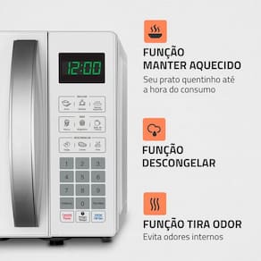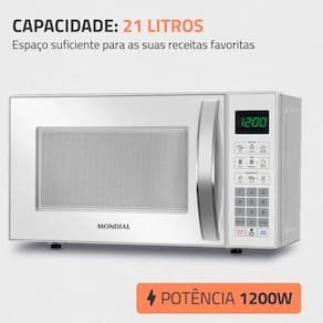- Capacidade: 21L - ideal para famílias ou quem prepara refeições completas. - Potência: 1.200W - aquece, descongela e cozinha com rapidez. - Funções especiais: * Menu Dia a Dia: 6 opções pré-ajustadas (ex.: leite, pizza, sopa). * Menu Kids: Receitas divertidas (pipoca, bolo de caneca, brigadeiro). * Descongelamento automático: Por peso ou tempo. * Manter aquecido: Preserva a temperatura dos alimentos. * Tira-odor: Elimina odores residual. - Segurança: Trava infantil e prato giratório de vidro resistente. - Display digital: Facilita o ajuste de tempo e potência (10 níveis).