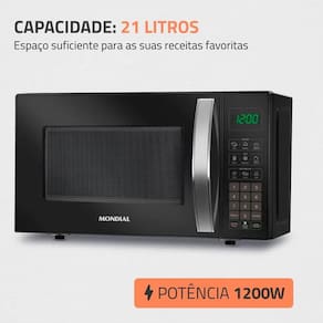 CAPACIDADE DE 21 LITROS: Espaço suficiente para as suas receitas favoritas. POTÊNCIA: 1200W: A alta potência proporciona mais rapidez nos preparos e descongelamentos. MENU DIA A DIA: A praticidade de preparar com um só clique as receitas utilizadas com mais frequência. FUNÇÃO DESCONGELAR: Com apenas um toque, permite descongelar de forma prática, diversos tipos de alimentos. FUNÇÃO MANTER AQUECIDO: Mantém o seu prato aquecido até o momento de consumir. FUNÇÃO TIRA ODOR: Elimina odores internos deixados pelas refeições. Mantenha o ambiente agradável e cheiroso e seu forno micro-ondas limpo por mais tempo. MENU KIDS: Permite preparar as receitas favoritas dos pequenos, como pipoca, brigadeiro e bolo de caneca, de forma prática e rápida. 10 AJUSTES DE POTÊNCIA: O sistema do micro-ondas vai de 1 a 10 e permite o ajuste da potência adequada para o tipo de alimento que você vai preparar. TRAVA DE SEGURANÇA: A função permite travar o uso do aparelho e aumenta a segurança com as crianças. DESIGN COMPACTO: O micro-ondas Mondial ocupa menos espaço sobre a pia, no armário embutido, em suporte para micro-ondas ou espaços reduzidos. EFICIENCIA ENERGÉTICA: Baixo consumo de energia: selo com classificação A de economia. QR CODE DE RECEITAS MONDIAL: O QR Code vem no próprio aparelho e possibilita que você acesse diversas receitas práticas e deliciosas para serem feitas no micro-ondas. UM ANO DE GARANTIA MONDIAL: A Mondial é a escolha de milhões de consumidores. Mondial, a escolha inteligente!