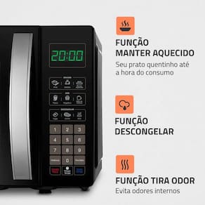 Modelo MO-01-21-B Potência 1200W Consumo 1,2Kw/h Voltagem 127V/220V Cor Preto Dimensões 26,2cm x 45,5cm x 34,8cm (AxLxP) Garantia 12 meses Material Aço Galvanizado e ABS Capacidade Total 21L Níveis de potência 10 níveis Funções Tira odor, descongelar, manter aquecido, menu dia a dia/menu kids e função relógio Prato giratório Sim Tecla iniciar fácil Sim