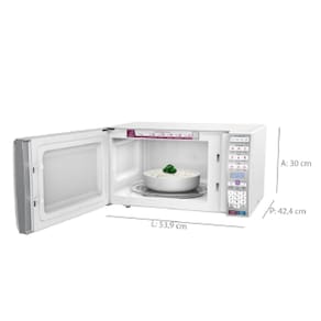 Micro-ondas Electrolux 34 litros com puxador semi-embutido, display digital, menu light, menu dia a dia, menu kids, função trava painel, função mudo, tecla início/30s, tecla porção, 10 níveis de potência, função tira odor, função limpa e função manter aquecido.Função Grill