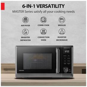 Micro-ondas 6 em 1 com tecnologia Inverter, funções de micro-ondas, fritadeira, forno de convecção, grelha, descongelador e Speedy Combi. Possui 10 níveis de potência, 11 menus automáticos, 10 menus Air Fry e 6 predefinições de descongelamento.Função Grill