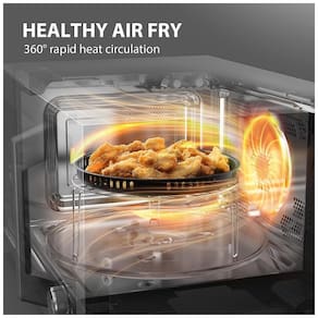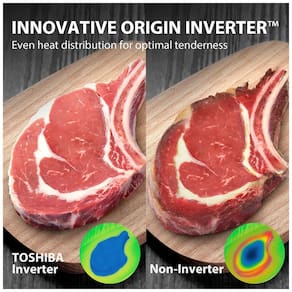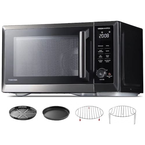 Micro-ondas de bancada Toshiba 7 em 1 com 10 níveis de potência, funções de micro-ondas, fritadeira, forno de convecção, grill, descongelador, cozimento combinado e sensor de umidade. Possui tecnologia Inverter, modos combinados e livro de receitas.Função Grill