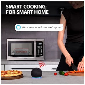 Micro-ondas de bancada em aço inoxidável com 36L, controle por aplicativo, integração com Alexa, sensor de umidade, função mudo, modo ECO e menus predefinidos.Função Grill