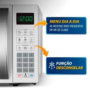Tudo ao seu alcance! Com o painel do seu mais novo micro-ondas, você poderá preparar suas receitas preferidas de forma rápida e fácil, pois ele conta com Menu Dia a Dia, que são receitas utilizadas com mais frequência, no Menu Kids você encontra os pratos favoritos das crianças, como pipoca, bolo de caneca e brigadeiro, além das funções Tira Odor, Potência, Descongelar, Manter aquecido e Descongelar.