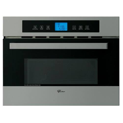 Micro-ondas de embutir Fischer Platinium 35L com acabamento em aço inox escovado, painel touch screen, sistema flat plate (sem prato giratório) e grill dourador.Função Grill