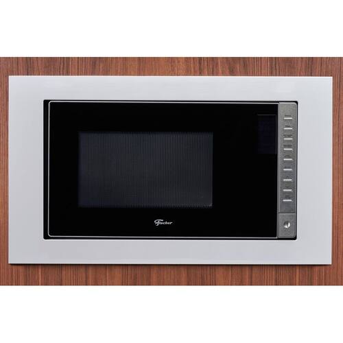 Micro-ondas Fischer Fit Line de embutir com capacidade de 25 litros, moldura em aço inox escovado, corpo interno pintado de branco, painel digital, timer, 5 níveis de potência e trava de segurança. Possui sistema de ventilação interna e saída de ar integrada.Função Grill