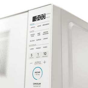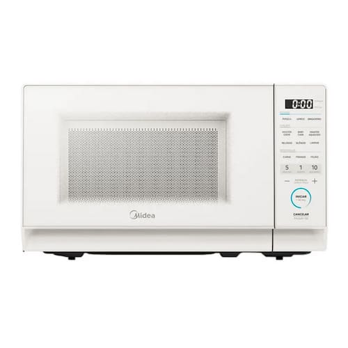Micro-ondas Midea Mastercook MHP20B1 com 20L de capacidade, 1050W de potência, 10 níveis de potência, display digital branco, prato giratório de 25,5 cm, funções pré-programadas (MasterCook, BabyCare, Manter Aquecido), sistema de toque rápido (+30 segundos), menu descongelar, desodorizador interno e classificação de eficiência energética A. Possui abertura horizontal com alça embutida e temporizador de até 99 minutos.Função Grill