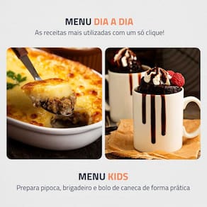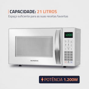 O Micro-ondas Branco da Mondial é sofisticado, eficiente e possui funções que facilitam sua vida na cozinha! Tem capacidade de 21 litros, 1.200W de potência, Display Digital e funções como Menu Dia a Dia, que oferece opções rápidas para refeições cotidianas, e Menu Kids, com receitas especiais para crianças. Descubra todas as funcionalidades do MO-01-21-W e transforme sua rotina! CAPACIDADE DE 21 LITROS Oferece a flexibilidade necessária para cozinhar, aquecer e descongelar uma variedade de pratos, desde refeições rápidas até pratos mais complexos. POTÊNCIA DE 1.200W Com alta potência, você prepara e descongela seus alimentos com mais rapidez e eficiência, facilitando sua rotina diária. MENU DIA A DIA Prepare as receitas que você mais usa com apenas um clique, otimizando seu tempo. FUNÇÃO DESCONGELAR A praticidade de descongelar alimentos de forma rápida e fácil, com apenas um toque. FUNÇÃO MANTER AQUECIDO Mantém seu prato na temperatura ideal até o momento de servir, garantindo sempre uma refeição quente e saborosa. MENU KIDS Prepare facilmente as receitas que as crianças adoram, como pipoca, brigadeiro e bolo de caneca. A hora do lanche vai ficar divertida e deliciosa! 10 AJUSTES DE POTÊNCIA Com 10 níveis de potência, você pode ajustar facilmente a intensidade para cozinhar, aquecer ou descongelar seus alimentos de forma eficiente. FUNÇÃO TIRA ODOR Mantenha seu forno micro-ondas limpo por mais tempo, eliminando os odores indesejados das refeições anteriores. TRAVA DE SEGURANÇA A função de trava de segurança proporciona tranquilidade, impedindo que as crianças utilizem o micro-ondas sem supervisão. DESIGN COMPACTO Sua cozinha fica organizada com o micro-ondas da Mondial, que ocupa menos espaço sobre a bancada, armário embutido ou em suportes. EFICIENCIA ENERGÉTICA Baixo consumo de energia: selo com classificação A de economia. QR CODE DE RECEITAS MONDIAL O QR Code vem no próprio aparelho e possibilita que você acesse diversas receitas práticas e deliciosas para serem feitas no micro-ondas. UM ANO DE GARANTIA MONDIAL A Mondial é a escolha de milhões de consumidores. Mondial, a escolha inteligente!
