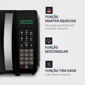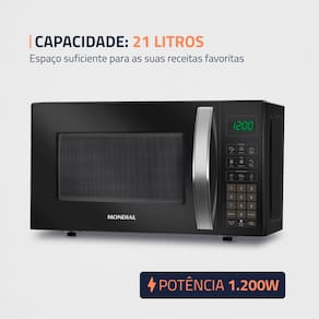 Capacidade: 21 litros Potência: 1200W Alimentação: Elétrico Tipo de acendimento: Digital Funções: Descongelar, manter aquecido, tira odor, menu dia a dia Consumo: 1,2 kWh Cor: Preto Dimensões: 26 × 45 × 33 cm Peso líquido: 10 kgCapacidade (litros)