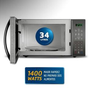 Micro-ondas com 34 litros de capacidade interna e 21 litros de volume útil. Potência de 1400W (consumo de 1453W). Possui 10 níveis de potência, função Kids (pipoca, bolo de caneca, brigadeiro), função Manter Aquecido, função Descongelar, Menu Dia a Dia e função Tira Odor. Inclui prato giratório de vidro com suporte e manual de instruções.Função Grill