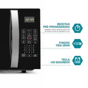 Micro-ondas Philco PMO30P com 28 litros de capacidade e 1100W de potência. Possui acabamento preto espelhado, painel digital com receitas pré-programadas, função descongelar por tempo ou peso, manter aquecido e tira odor. Pintura interna Limpa Fácil e prato giratório de 285mm. 10 níveis de potência.Função Grill