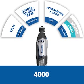 Descrição: A Dremel 4000 é a micro retífica ideal para quem solicita a máxima precisão e praticidade, seja um artesão ou instalador. Existem mais 8 funções diferentes em uma única ferramenta para que você possa se destacar em projetos, com garantia de resultados perfeitos de maneira prática. E para profissionais, é um complemento ideal para sua caixa de ferramentas e um verdadeiro coringa para trabalhos imprevistos, Além disso, essa versão vem com uma maleta metálica para guardar suas ferramentas e acessórios.