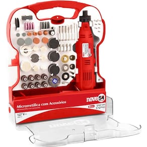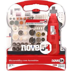 Versátil e prática de usar, permite a realização de inúmeras atividades utilizando os acessórios que acompanham a micro retífica - Especificações Técnicas da Micro Retífica: :: Tensão: 110v :: Potência: 130w :: Frequência: 60hz :: Rotação: 8.000 - 30.000 rpm :: Diâmetro da pinça: 3,1mm - 1/8" - Composto por 171 peças, sendo: :: 1 abrasivo :: 1 Chave para micro retífica :: 4 Cilindros de feltro :: 74 Discos de corte :: 10 Discos de lixa :: 1 Escova circular de inox com haste :: 1 Escova circular de latão com haste :: 1 Escova circular de nylon com haste :: 2 Escovas pincéis inox com haste :: 1 Escova pincel latão com haste :: 1 Escova pincel nylon com haste :: 2 Hastes para disco de corte :: 1 Haste para disco de feltro :: 2 Hastes para lixa cilindro :: 1 Haste para roda de pano :: 7 Limas rotativas :: 3 Limas rotativas diamantadas :: 30 Lixas cilindro :: 1 Pasta para polimento :: 4 Pinças para micro retífica :: 1 Ponta com feltro :: 10 Pontas montadas :: 4 Rebolos de carbureto de silício :: 4 Rebolos de óxido de alumínio :: 1 Roda de borracha :: 1 Roda de feltro :: 1 Roda de lixa :: 1 Roda de pano - Marca: Nove54 Ean: 7893946468316