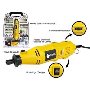 - Marca: Charbs - Kit Especial com Eixo Flexível Chicote - Potência: 135W - Frequência: 60 Hz - 6 Velocidades - Velocidade Variável entre 8.000 e 30.000 Rpm - Acompanha maleta e 234 acessórios - Isolação Dupla - Peso bruto: 1,8Kg - Garantia: 90 dias