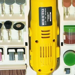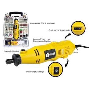 Kit Micro Retífica com Chicote e 234 Acessórios Maleta Mini Furadeira Profissional Charbs Mini Retífica Charbs é a ferramenta ideal para trabalhos de desbaste, remoção, limpeza, polimento, gravação, lixamento e furação de diferentes tipos de materiais e superfícies. Tenha em mãos um kit que reúne tudo o que você precisa em uma exclusiva maleta portátil para você levar onde for - Marca: Charbs - Kit Especial com Eixo Flexível Chicote - Potência: 135W - Frequência: 60 Hz - 6 Velocidades - Velocidade Variável entre 8.000 e 30.000 Rpm - Acompanha maleta e 234 acessórios - Isolação Dupla - Peso bruto: 1,8Kg - : 90 dias Itens inclusos: - 1 Micro Retífica Charbs - 1 Eixo Flexível - 6 Pinças - 8 Tubos de Lixa - 3 Brocas - 9 Pontas diamantadas - 2 Suporte para discos de corte - 1 Suporte para disco de polimento - 2 Suportes para tubos de lixa - 3 Escovas de nylon - 3 Escovas de metal - 10 Pontas montadas - 1 Frasco com paste de polimento - 7 Discos de polir - 14 Discos de desbastar - 90 Discos de lixa - 65 Discos de corte - 5 Discos de corte reforçados - 1 Pedra de amolar - 1 Chave de troca - 1 Ponta para polir Marca: Não Informado