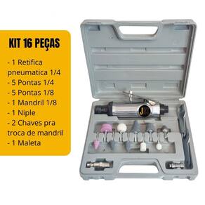 Acompanha 1 micro retífica pneumática JMR16, 5 pontas de 1/8” (3 mm), 5 pontas de 1/4” (6 mm), 2 chaves, 2 pinças de 1/8” (3 mm) e 1/4” (6 mm), 1 conector de engate rápido 1/4”, 1 maleta plástica e manual de instruções.