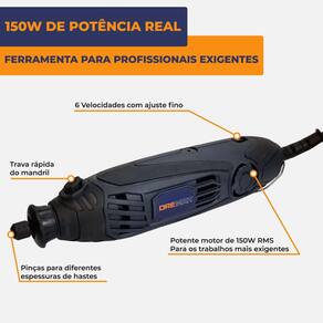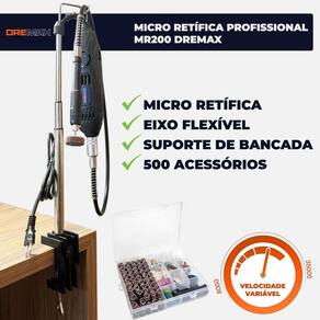 Micro retífica profissional 150w com chicote suporte e 500 acessórios dremax Você está cansado de ferramentas que não entregam o que prometem Precisa de precisão, potência e variedade para realizar trabalhos minuciosos em diferentes materiais A micro retífica dremax mr200 é a ferramenta ideal para quem exige mais da sua oficina, do hobby ou do trabalho profissional. Com 150w reais de potência e 500 acessórios inclusos, ela lixa, corta, grava, polimenta, perfura e muito mais com extrema qualidade e acabamento fino. Por que escolher a mr200 dremax - potente motor de 150w rms: performance de verdade sem quedas de rotação - 6 velocidades variáveis: controle total entre 8.000 a 30.000 rpm - eixo flexível chicote : leveza e precisão para detalhes finos - suporte de bancada incluso: liberdade para trabalhos fixos e contínuos - acompanha 500 acessórios: variedade para todas as tarefas madeira, metal, vidro, pedra, plástico, borracha, couro... - organizador incluso: mantenha os seus acessórios à mão e bem guardado - mandril com trava rápida e pinças ajustáveis : agilidade e adaptação para diversas hastes Inúmeras aplicações: - corte de precisão em metais e plásticos - gravações artísticas em madeira e vidro - polimento e acabamento em joias - lixamento detalhado de cantos e curvas - restauração de objetos delicados - modelismo, artesanato, bijuteria e marcenaria ou hobby A dremax atende ambos Não importa se você é um artesão, ourives, marceneiro ou apenas apaixonado por criar: a dremax mr200 é a solução versátil que resolve as frustrações de quem precisa de acabamento perfeito sem esforço. Itens inclusos - 1 micro retífica dremax - 1 eixo flexível chicote - 1 suporte de bancada - 145 tubos de lixa 12,7mm 1/4 pol. grão 60 - 145 tubos de lixa 6,4mm 1/8 pol. grão 60 - 4 pinças 1.6, 2.4, 3.0 e 3.2mm - 9 brocas 1.5mm 3x 2.4mm 4x 3mm 2x - 10 discos de corte 32mm reforçados - 125 discos de corte 22mm - 20 rebolo abrasivo 20mm grão 220 - 1 disco de borracha para polir 20mm - 2 pontas montadas carboneto de silício verde - 3 pontas montadas óxido de alumínio laranja - 2 discos de feltro 25,4mm - 2 discos de feltro 12,7mm - 2 pontas de feltro 10mm - 1 roda de pano com costura - 1 disco flap com haste grão 80 - 3 pontas diamantadas - 2 suporte para discos de corte - 1 suporte para disco de polimento - 1 suporte para tubos de lixa 1/4 - 1 suporte para tubos de lixa 1/8 - 2 escovas de nylon - 1 escova de metal - 2 escovas de latão - 1 frasco com pasta de polimento - 1 chave de mandril - 1 pedra de amolar - 1 organizador para acessórios - 1 caixa embalagem de papelão Um ou outro acessório pode variar de acordo com o lote Faq - dúvidas frequentes 1. Quais materiais posso trabalhar com a mr200 Madeira, metais, mdf, plástico, vidro, borracha, couro, porcelanato, aço inox, gesso, cerâmica, granito, mármore e muito mais. 2. A micro retífica é bivolt Não, verifique a voltagem disponível no anúncio 110v ou 220v, conforme o modelo disponível . 3. O eixo flexível é removível Sim você pode usar com ou sem o eixo flexível. Basta conectar ou remover conforme a necessidade do trabalho. 4. Posso usar acessórios de outras marcas Sim a dremax é compatível com acessórios padrão universal diâmetros de 1.6mm a 3.2mm . É indicada para uso contínuo Sim o motor de 150w permite uso prolongado com segurança, mas recomendamos pausas periódicas em uso contínuo de alta rotação.