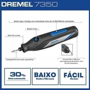 Ficou alguma dúvida Faça sua pergunta, ficaremos satisfeitos em lhe atender bem. Emitimos . Qualidade, preço Justo e atendimento Perfeito. O mais novo lançamento da Dremel na linha de Micro Retíficas sem fio. A Micro Retífica 7350 é produzida pela DREMEL, empresa do Grupo Bosch. A DREMEL fabrica as melhores ferramentas rotativas elétricas de multiuso. Com a Micro Retífica DREMEL 7350 é possível cortar, gravar, esculpir, lixar, limpar, polir, esmerilhar, afiar e perfurar. Ferramenta de multiuso projetada para entregar mais leveza e suavidade com um uso simples e fácil. Apresentando a mais recente tecnologia em bateria de carregamento rápido, a 7350 apresenta 30% de melhoria no tempo, resultando em menor tempo de parada entre projetos. Os trabalhos com a DREMEL 7350 podem ser aplicados nos seguintes materiais: madeira, metal, plástico, couro, EVA, papelão, cerâmica, pedra e vidro. Acessórios inclusos : 1 Cabo USB 1 Pedra de Esmerilhar de Carboneto de silício de 4,8 mm 1 Cinta de Lixa e Mandril de 13 mm, grão 60 1 Cinta de Lixa de 13 mm, grão 120 1 Disco de Polir de 13 mm 1 Chave para Mandril A Micro Retífica DREMEL 7350 é um equipamento versátil de multiuso, podendo ser adquirido posteriormente e separadamente, diversos outros acessórios compatíveis com a Micro Retífica, como: chaves, lixas, brocas, discos de corte, etc. Especificações Técnicas do Produto: Tensão da Bateria - 4,0 v Cumprimento - 7,5 cm Largura 1,5 cm Cód. Bosch: F0137350LA Ficou alguma dúvida Faça sua pergunta, ficaremos satisfeitos em lhe atender bem. Emitimos . Qualidade, preço Justo e atendimento Perfeito.