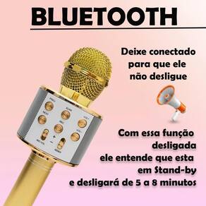 Microfone bluetooth karaokê . Ws-858 A última foto do anúncio visto apenas pelo computador , é um vídeo explicando todas as funções dos botões para você aproveitar ao máximo e se divertir com o microfone e todas sua família Diversão para crianças e adultos. Lembrando, é um microfone de brinquedo e não um microfone profissional Orientação complementar O microfone depois de ligado tem duração de uso entre 5 a 8 minutos, sendo desligado automaticamente após esse período para preservação da bateria, haja vista ser utilizado por crianças que poderiam deixa-lo ligado. Caso deseje que fique ligado de forma ininterrupta, orientamos ligar o microfone no bluetooth. O aparelho é a bateria e o produto só é carregado para teste. Quando ele chegar até você, o carregue por aproximadamente 4h para o total aproveitamento do seu produto. A duração da bateria é por volta de 3h de uso. Nós agradecemos a preferência e ficamos à disposição. Funções: Microfone; Possui 5 opções de voz através do botão rec ; Karaokê conectando com o bluetooth no spotify, youtube, etc ; Caixa de som; Gravador conectando um pen drive, ele grava o que você fala ; Rádio. Especificações: Modelo: ws -858 Material: abs shell Tamanho do item: aprox. 23cm x 7cm x 7cm Potência de saída: 5w Tensão de carregamento: dc 5v = 1a Faixa de frequência: 100hz-10khz Capacidade da bateria: 1800mah Nível máximo sonora: 115db 1khz thd1% Modo de reverberação: reverberação de som de eco Fonte de alimentação: bateria de íons de lítio embutida Tempo de carregamento: cerca de 4 horas Tempo de trabalho: cerca de 4 horas Conteúdo da embalagem: 1 microfone na cor escolhida; 1 cabo de carregamento usb. obs: não acompanha a fonte de carregamento, somente o cabo . do vendedor: 30 dias Homologação Inmetro: IP-BRI-0169/2022-01 Marca: Não Informado