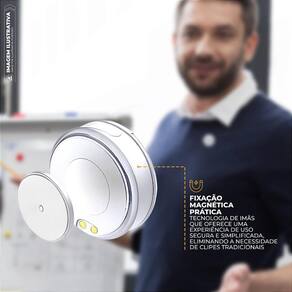 Sistema magnético fixa o microfone na roupa com conforto e discrição.