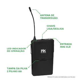 Com o microfone sem fio Px-1000a, você tem a melhor experiência em som profissional. Com 2 microfones Sem fio tipo , frequências individuais com alcance de até 60 metros, Fácil instalação e controles de volume individuais por canal, essa é a opção Ideal para apresentações, cultos, karaokês, palestras e eventos. Uhf compacto com 2 microfones lapela / headset e controles de volume individuais. - alta relação sinal-ruído - distorção super baixa - amplo alcance: até 60 metros em circunstâncias ideais, 15 metros de raio em condições normais. Microfone/transmissor - potência do transmissor: 30mw - emissão de espúrios: 40db - display: led - voltagem de bateria 1.5v x 2 - vida útil da bateria: até 8 horas - anatel: 16222-20-13478 Atenção: Não utilizar mais de 1 microfone modelo e frequência no mesmo ambiente, pois dará interferência no sinal. Especificações técnicas: Microfone sem fio e 2 microfones de headset/ lapela 595,10 632,10 mhz Homologação Anatel: 110052213346 Marca: Não Informado Ean: 7899744062893