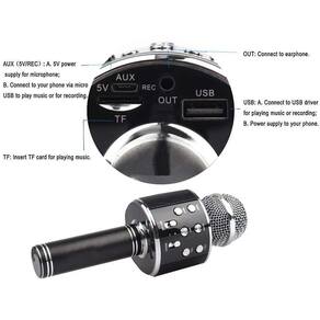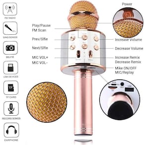 Microfone profissional bluetooth sem fio handheld karaoke ktv usb jogador alto-falante Microfone bluetooth karaokê show sem fio android e ios recarregável este é um produto 2 em 1:Você pode utilizar ao mesmo tempo a caixa de som embutida e o microfone e fazer um divertido karaokeEste microfone portátil conta com uma caixa de som embutida nele, com ele você pode simplesmente cantar e ter sua voz amplificada nos alto-falantes assim além de poder sincronizar seu celular ou notebook via bluetooth e reproduzir um playback e cantar junto, ou simplesmente deixar ele tocar como uma caixa de som portátil.Existe ainda a opção de conectar este microfone em uma caixinha de som ou caixa amplificada através do cabo auxiliar (p2) e cantar alto pra valer com o som saindo em alto-falantes externos potentes.Por ser um produto que possui uma saída auxiliar ( aux), permite a conexão em uma caixa de som externa para reprodução da voz via cabo, este produto pode ser utilizado para pequenas apresentações.Recursos:- microfone karaokê, canta e o som sai no próprio microfone.- botão karaokê, reduz o som da música e dá destaque na voz.- controle de volume e som e do microfone, pause play, liga e desliga, botão eco, passar e voltar faixas.- caixa de som, sincronize por bluetooth, conecte cartão ou pen drive e deixe tocar.- interfaces de entrada: conexão bluetooth, cartão de memória e pen drive (para tocar música).- conexão de saída: p2 femea, pode ser utilizada para gravação ou para reproduzir em uma caixa amplificada.- não reproduz em caixas amplificas por bluetooth, apenas via cabo p2 (não incluso).- carregamento: qualquer portas usb ou carregador de celular 5v. (cabo de carreamento incluído).Especificação do produto:Compatibilidade: compatível com android e iosPotência de saída: 3 w rms x 2Faixa de frequência: 100hz a 10 khzBateria de lítio embutida de 1200mahTensão de carregamento: 5 v dc (usb ou carregador de celular)Versão do bluetooth: 3.0Peso do produto: 208gConteúdo da embalagem:1 x microfone karaokê bluetooth1 x cabo micro usb de carregamento1 x manual