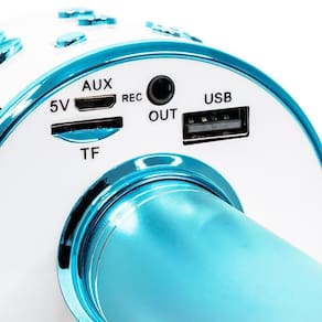 Microfone karaokê com conexão via bluetooth, permite que você conecte ao seu celular, para reproduzir músicas de sua preferência.