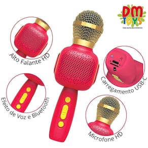 O Microfone Karaokê é muito divertido Conecte o seu smartphone e cante junto as suas músicas preferidas Com efeitos de voz para você brincar com amigos Possui entrada para cartão de memória SD e é recarregável.