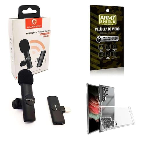 Microfone Sem Fio Profissional com presilha Tipo C H'maston O Microfone Sem Fio Profissional com presilha Tipo C H'maston de alta sensibilidade com captação de áudio 360 graus, possui resposta rápida para que você grave todos os detalhes de som Qualidade de som pura, comparável a uma equipe de gravação profissionalEste Microfone Sem Fio H'Maston MK-04 Wireless 360 com Interface USB-C para SmartPhone e Tablets Android, além de PC com entradas USB-C Type-C , possui uma alta qualidade de som, é portátil e muito fácil de usar, sendo Plug and play apenas colocar em seu smartphone e usar. O Sistema Wireless de Microfone Lapela para Equipamentos USB-C possui Bateria Interna com duração de até 10 horas e trabalha com uma distância de até 20m. O Microfone Sem Fio Profissional com presilha Tipo C H'maston é emparelhado automaticamente imediatamente após a conexão, sem necessidade de aplicativos, sem fios irritantes, sem depuração, apenas conexão instantânea Principais Características: Plug and play, conexão de um clique, fácil de usar. Áudio limpo e preciso e mão livres ao gravar Conector USB-C para SmartPhone e Tablets Android Captação de áudio sem ponto cego de 360 grau Latência muito baixa de 9 milissegundos Alcance de até 20 metros em locais sem obstáculos Função antirruído do circuito de redução de ruído Bateria Interna com duração de até 10 horas Qualidade de som pura e alta sensibilidade Compatível com uma variedade de dispositivos Adequado para todos os tipos de transmissão ao vivo, gravação, entrevista, gravação de vídeo, Vlogs, Youtubers, aulas online e muito mais.-------------Película de Vidro 3D Blindada - ArmyshieldA película de vidro 3D para celular é um produto de alta qualidade que oferece proteção e estilo para o seu dispositivo móvel. Feita de vidro temperado de alta resistência, a película é projetada para se encaixar perfeitamente na tela do seu celular, proporcionando uma cobertura completa e proteção contra arranhões, rachaduras e outros danos.A película de vidro 3D é especialmente projetada para se curvar suavemente ao redor das bordas do seu celular, criando uma aparência elegante e sem bordas. Isso significa que você pode desfrutar de uma experiência de visualização imersiva e sem interrupções, sem se preocupar com a película descolando ou interferindo na sensibilidade da tela.Atenção: O produto acompanha apenas o que apresenta na imagem.