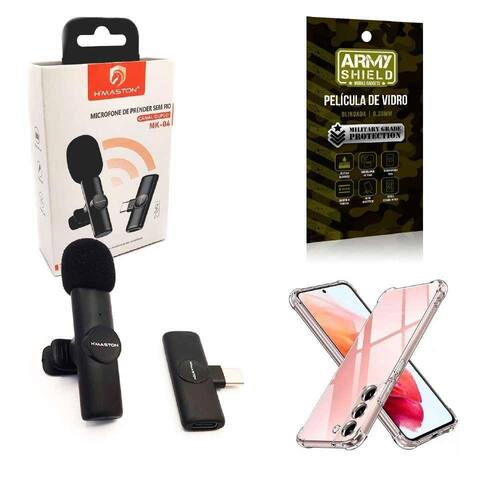 Microfone Sem Fio Profissional com presilha Tipo C H'maston O Microfone Sem Fio Profissional com presilha Tipo C H'maston de alta sensibilidade com captação de áudio 360 graus, possui resposta rápida para que você grave todos os detalhes de som Qualidade de som pura, comparável a uma equipe de gravação profissionalEste Microfone Sem Fio H'Maston MK-04 Wireless 360 com Interface USB-C para SmartPhone e Tablets Android, além de PC com entradas USB-C Type-C , possui uma alta qualidade de som, é portátil e muito fácil de usar, sendo Plug and play apenas colocar em seu smartphone e usar. O Sistema Wireless de Microfone Lapela para Equipamentos USB-C possui Bateria Interna com duração de até 10 horas e trabalha com uma distância de até 20m. O Microfone Sem Fio Profissional com presilha Tipo C H'maston é emparelhado automaticamente imediatamente após a conexão, sem necessidade de aplicativos, sem fios irritantes, sem depuração, apenas conexão instantânea Principais Características: Plug and play, conexão de um clique, fácil de usar. Áudio limpo e preciso e mão livres ao gravar Conector USB-C para SmartPhone e Tablets Android Captação de áudio sem ponto cego de 360 grau Latência muito baixa de 9 milissegundos Alcance de até 20 metros em locais sem obstáculos Função antirruído do circuito de redução de ruído Bateria Interna com duração de até 10 horas Qualidade de som pura e alta sensibilidade Compatível com uma variedade de dispositivos Adequado para todos os tipos de transmissão ao vivo, gravação, entrevista, gravação de vídeo, Vlogs, Youtubers, aulas online e muito mais.-------------Película de Vidro 3D Blindada - ArmyshieldA película de vidro 3D para celular é um produto de alta qualidade que oferece proteção e estilo para o seu dispositivo móvel. Feita de vidro temperado de alta resistência, a película é projetada para se encaixar perfeitamente na tela do seu celular, proporcionando uma cobertura completa e proteção contra arranhões, rachaduras e outros danos.A película de vidro 3D é especialmente projetada para se curvar suavemente ao redor das bordas do seu celular, criando uma aparência elegante e sem bordas. Isso significa que você pode desfrutar de uma experiência de visualização imersiva e sem interrupções, sem se preocupar com a película descolando ou interferindo na sensibilidade da tela.Atenção: O produto acompanha apenas o que apresenta na imagem.