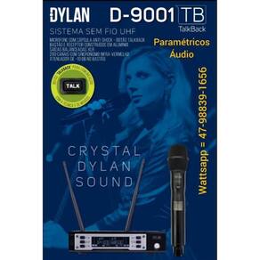 Sistema sem fio com 1 microfone d-9000 com chave de comando para conversar com tecnicos talk back d-9001 Apresentamos o d-9001 tb, um sistema sem fio com a função talkback para comunicação em tempo real entre o artista e sua banda ou técnicos de som. O do d-9001 tb conta também com a consagrada cápsula dinâmica cardiolde do d-9000 s e o atenuador de -10 db de ganho de entrada. Homologação Anatel: 110052213346 Marca: Não Informado