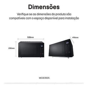 Marca: LG País de Origem: China Cor da Porta: Preto Design da Porta: Dividida Limpa Fácil: Sim Tipo de Instalação: Em bancada Cor Externa: Preto Capacidade do Forno: 30 Litros Tipo: Solo Recursos Convenientens: