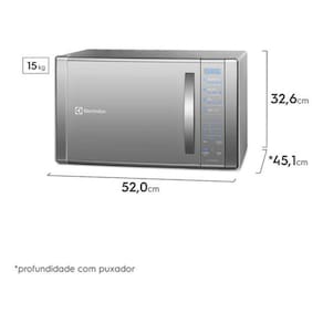 Espelhado, com Painel Touch On Glass, Função Grill , Display LCD, Grill e 3 níveis de potênciaMicro-Ondas ME41X com painel Touch On Glass e Função Grill Destaques Painel Blue Touch Um lindo e elegante painel de vidro espelhado, cujas funções se acendem e são acionadas com um simples toque no painel Porta Espelhada Pequeno detalhe que confere mais beleza para o micro-ondas. Deixe sua cozinha ainda mais charmosa Função Grill Doura os alimentos, dando um toque a mais nas receitas Interior em Aço inox Durabilidade e facilidade de limpeza Tira odor Seu micro-ondas limpo e sua cozinha agradável QRCODE Video com passo a passo das receitas dos menus Menu dia-a-dia Prepara as receitas mais usadas como arroz, macarrão e batata Menu Kids Prepara as receitas prediletas das crianças como bolo de caneca, Pipoca e brigadeiro Menu Descongelar Com apenas um toque descongela carne, frango, peixe e feijão Função Potência / Porção Escolha a quantidade do alimento para o cozimento e a potência ideal Painel Numérico É só apertar o tempo desejado para acionar o funcionamento do micro-ondas Função Mudo Aperte a tecla 0 por 4 segundos e o som do bip desaparece Desliga Display Economia de energia, desligue o painel digital quando terminar de usar o aparelho Relógio Facilidade no ajuste da hora Trava de segurança Função que permite travar o aparelho quando você quiser. Ideal para evitar que crianças ou pessoas não autorizadas possam acioná-lo 10 níveis de Potência São diversos ajustes de potência para cozinhar em seu micro-ondas Início +30s Inicia e pausa o programa ou tempo selecionado Características Tipo: De mesa Função Grill Painel Eletrônico Touch On Glass Pratos Pré-programados: Menu dia-a-dia, Menu Kids, Menu Descongelar Favoritos: Menu dia-a-dia Timer Especificações Técnicas Modelo: ME41X Cor: Prata Capacidade Total: 31 litros Capacidade Útil: 18 litros Potência: 1550 W Nível de Potência: 10 Consumo de Energia: 0,02 kwh/mês Selo Procel Eficiência Energética : B Acabamento: Porta espelhada + e acabamento na cor prata Porta Espelhada Prato Giratório Luz Internar Relógio Voltagem: 110V ou 220V não é bivolt EAN: 7896584076424 110V / 7896584076431 220V : 12 meses Dimensões e Peso Dimensões do produto sem embalagem AxLxP : 325x530x450 mm Dimensões do produto com embalagem AxLxP : 355x555x480 mm Peso do produto sem embalagem: 15,2 kg Peso do produto com embalagem: 15,8 kg Marca: Não Informado