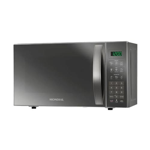 Microondas Mondial 21 Litros com 1200W de potência, design espelhado, funções Menu Dia a Dia, Menu Kids, Descongelar, Manter Aquecido e Tira Odor. Possui 10 níveis de potência, trava de segurança e display digital.Função Grill