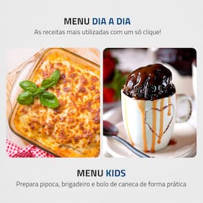 - MENU KIDS: A função permite preparar as receitas favoritas dos pequenos, como pipoca, bolo de caneca e brigadeiro, de forma rápida e prática. Proporciona mais independência à criançada e liberdade aos pais.
